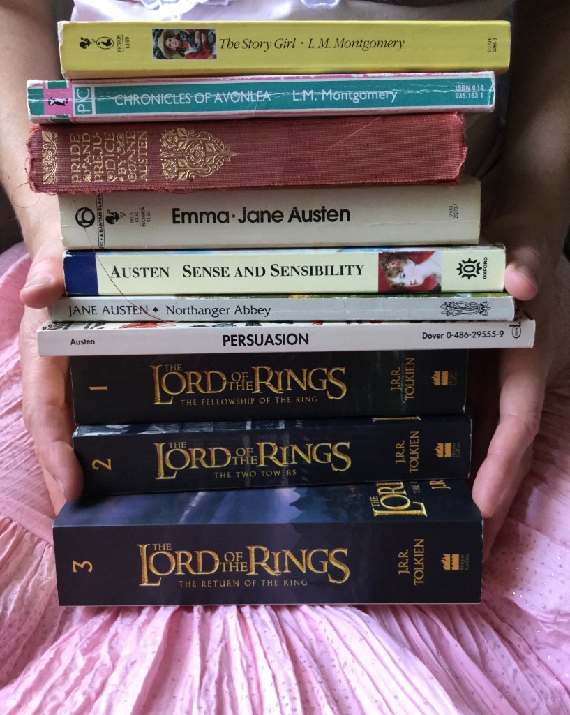 Sometimes the best cure for feeling queasy is simply not thinking about it so much, but that is difficult to do by sheer will power alone. It helps instead, to be distracted and think of something else. This is where reading novels comes in. Or rereading them, as the case may be…almost all the books pictured above were rereads, because I love returning to familiar worlds whose characters I already “get along with” and whose adventures, despite all misadventures along the way, are comfortingly going to turn out well.